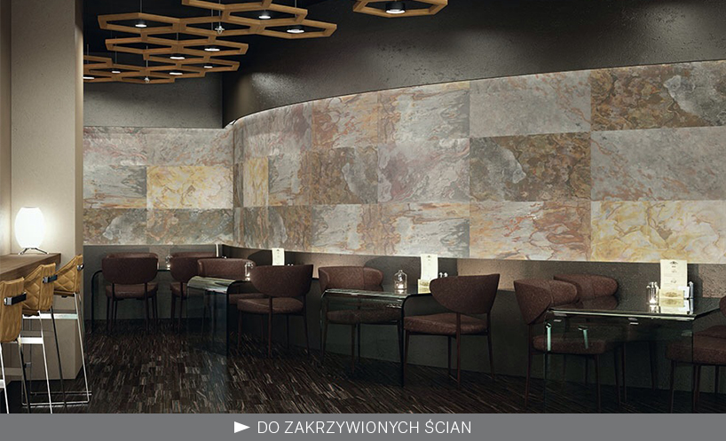 Każdy arkusz SKIN Flexible Slate jest wyjątkowy, ponieważ nie ma dwóch takich samych naturalnych tekstur. Produkt jest dostępny w dużych arkuszach, panelach lub mozaikach, od tekstur w odcieniach żółci po półprzezroczyste wzory, które można rozjaśnić, od jednolitych kolorów po organicznie wzorzyste tekstury.