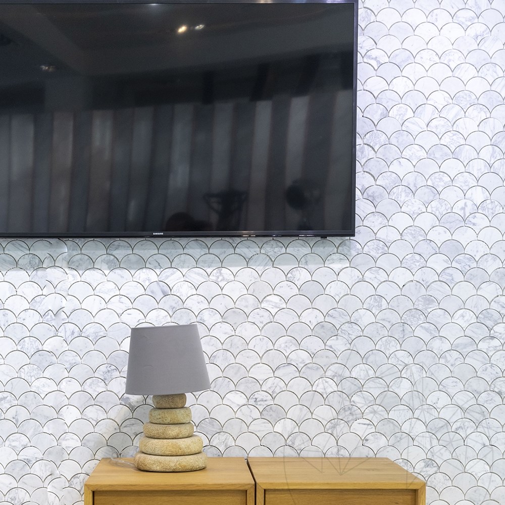 Z drobnymi wyjątkami neutralne kolory pasują do każdego projektu dekoracyjnego. Szlifowane wykończenie pozwoli w niewielkim stopniu odbijać światło. Pokrycie ściany salonu marmurową mozaiką w kształcie rybiej łuski jest eleganckie i przyjazne. W przypadku projektów dekoracji kuchni, okładzina z mozaiki z marmuru Bianco Carrara Honed Fish Scale Mosaic jest zalecana do backsplash, w połączeniu z innymi płytkami lub do okładziny całej ściany. Efekt ten odtwarza falowanie ryb w wodzie i generuje podobny stan dobrego samopoczucia.