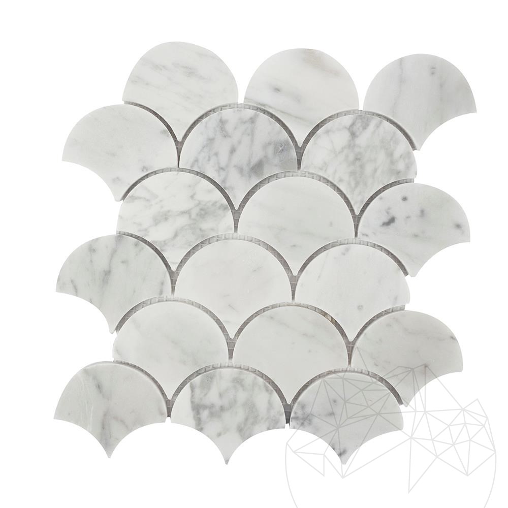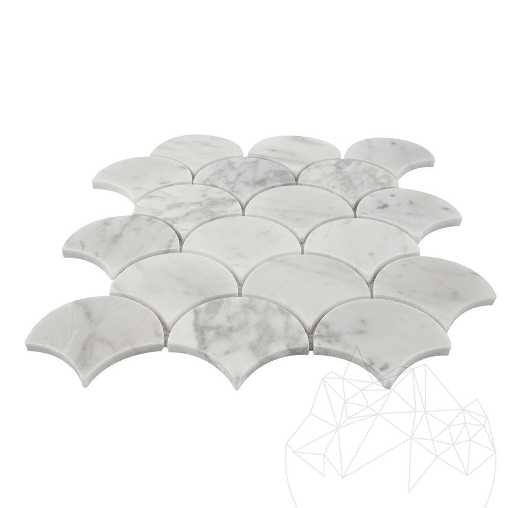 Marmurowa mozaika z układem rybich łusek ma niepowtarzalny wygląd. Oprócz niesamowitej jakości tego materiału, marmur z Carrary słynie od setek lat ze swojego piękna, wycięcie w półkolu robi wrażenie, a podobieństwo do ryby sprawia, że idealnie nadaje się do wilgotnych przestrzeni. Pokryta tą mozaiką ściana łazienki będzie wydawała się wyższa, a liczne stylizowane „głowy”, przypominające grupę kopców, powiększą przestrzenie bez poczucia bałaganu. W przypadku zastosowania na podłodze mozaika ta wskaże drogę.