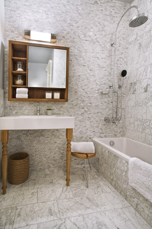 A second idea for marble decoration projects is to choose more than one tile size, similar to what Patrick Perez Architect did for the bathroom in the image below, in which at least three types of tiles were used from the same marble. The wall on which the mirror cabinet is located is cladded with marble mosaic; larger tiles were used for the flooring, while the wall close to the shower was cladded with medium size marble tiles. The result is interesting and transmits personality, while the dynamics was shaped on fine coordinates, starting from this visual extra-layer of tile size.