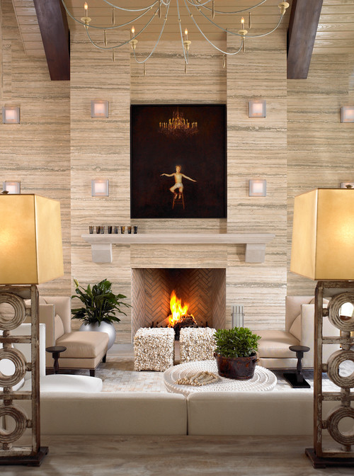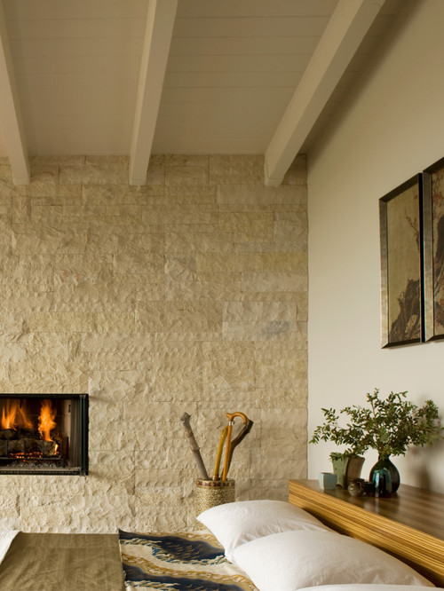 Następnie w salonie lub sypialni trawertynowa ściana tworzy naturalny, mocny i relaksujący akcent. Beżowe odcienie kamienia w połączeniu z drewnianymi meblami i dekoracjami z naturalnych włókien nadadzą spokojnej elegancji, podobnie jak na zdjęciu. Ciekawy jest również pomysł z kominkiem wbudowanym w ścianę.
