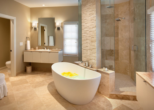 Jasny odcień w projekcie dekoracji łazienki wykorzystuje różne wykończenia z tego samego materiału. Na poniższym zdjęciu łazienka jest w całości wyłożona Trawertynem Klasycznym lub Latte, kolor ścian kontynuuje jasne odcienie kamienia, a jedyną fakturą, która się wyróżnia, jest dotyk ściany pokrytej mozaiką z tego samego materiału typu 3D Wall Mosaic .