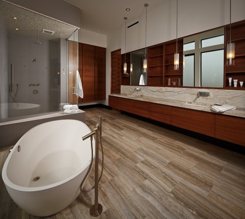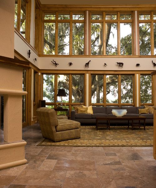 The example below features a travertine flooring, a point of attraction from an impressive residence. This is an example to observe material’s versatility - the tile displays an energy rather close to marble.