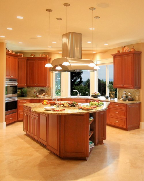 An island-style kitchen in the center, in strong colors – in here, the travertine heats up the strong red, adding an elegant touch to the entire setting.