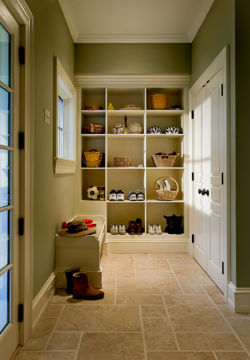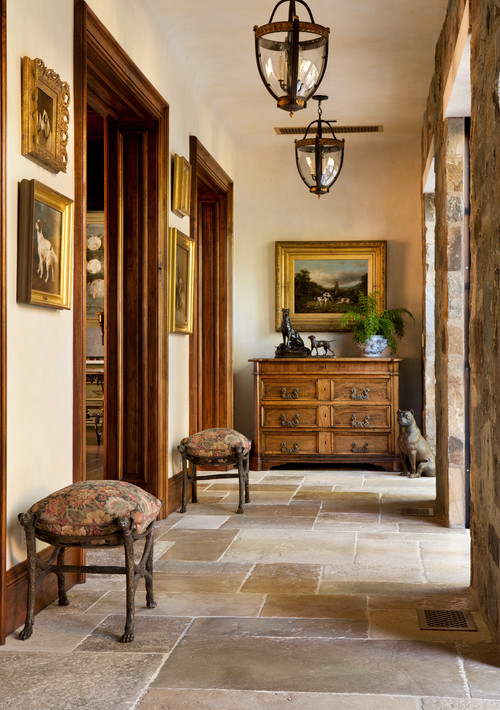 A hallway with rustic touches - French pattern set chosen travertine, with chiseled edges and tumbled surface, close to French Rustic Interior Design.