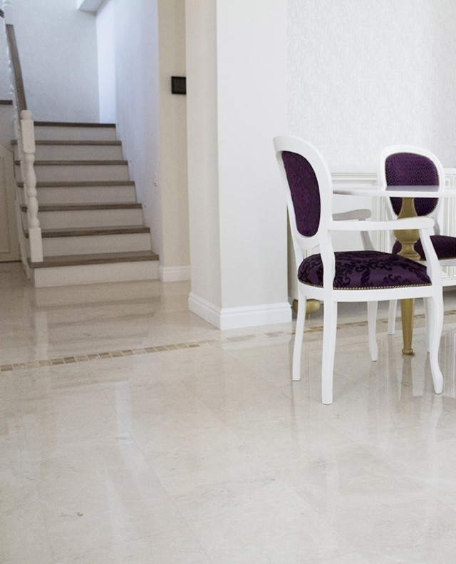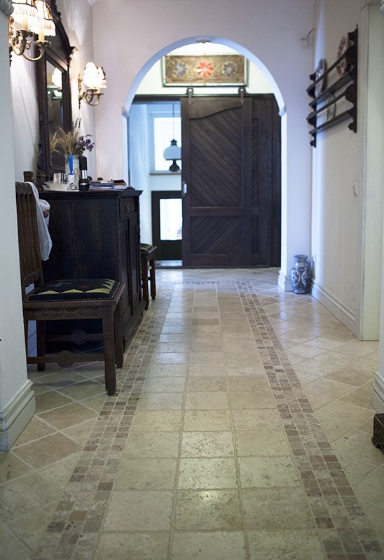 Przedpokój, posadzka z kamienia naturalnego ( trawertyn mozaikowy ) – część serii projektów klientów PIATRAONLINE