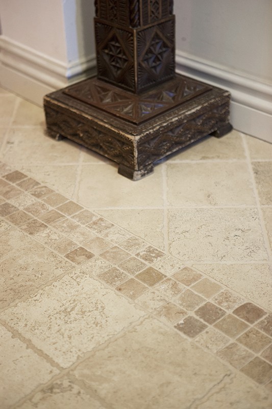 Detal posadzki – trawertyn klasyczny i trawertyn mozaikowy – część serii projektów klientów PIATRAONLINE