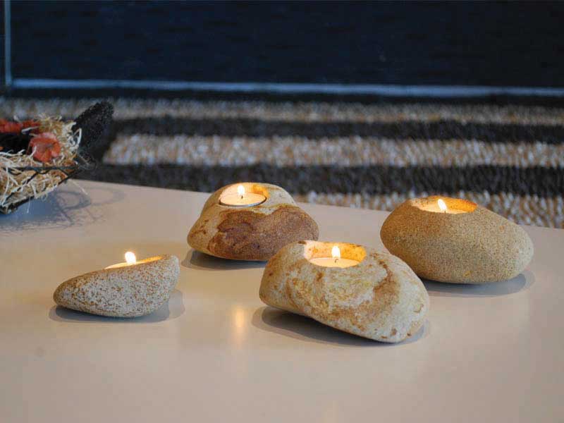 Kilka specjalnych elementów uzupełniających atmosferę to ręcznie robione świeczniki wykonane z piaskowca.